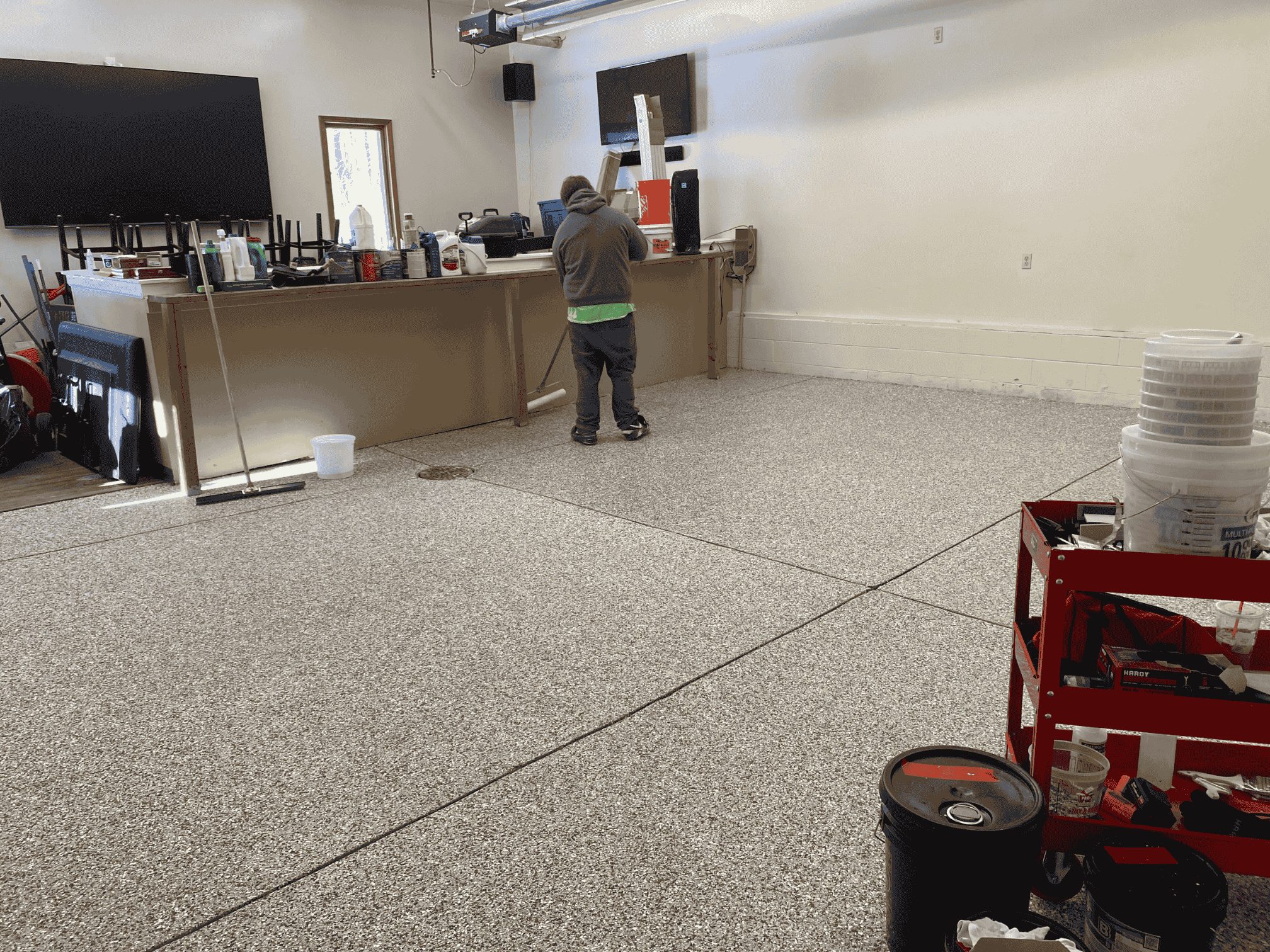 Next came the decorative flake broadcast. Flakes are applied by hand and tossed airborne to ensure even distribution and full coverage. We intentionally apply a heavy broadcast to completely saturate the surface, which improves durability and creates a uniform, attractive finish.